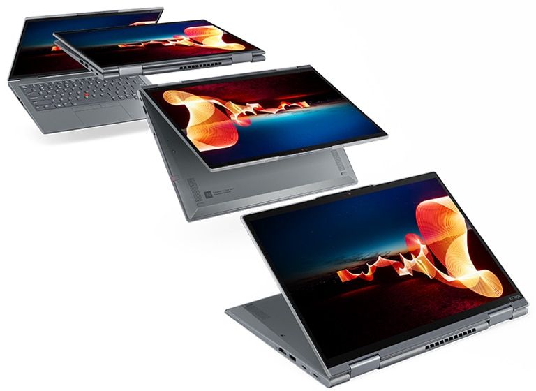 Dzięki zawiasowi 360° konwertowalny laptop ThinkPad X1 Yoga Gen 7 można bardzo szybko przełączać się między różnymi trybami – laptopa, tabletu, namiotu i podstawy. Bez względu na to, dokąd zaprowadzi Cię Twoja praca, urządzenie ma tryb dostosowany do Twojego stylu. Co więcej, możesz w ciągu kilku sekund przejść od pracy na klawiaturze do wykorzystania ThinkPad Pen Pro, gdy chcesz szkicować, podpisywać dokumenty lub robić notatki za pomocą w pełni ładowanego pióra.