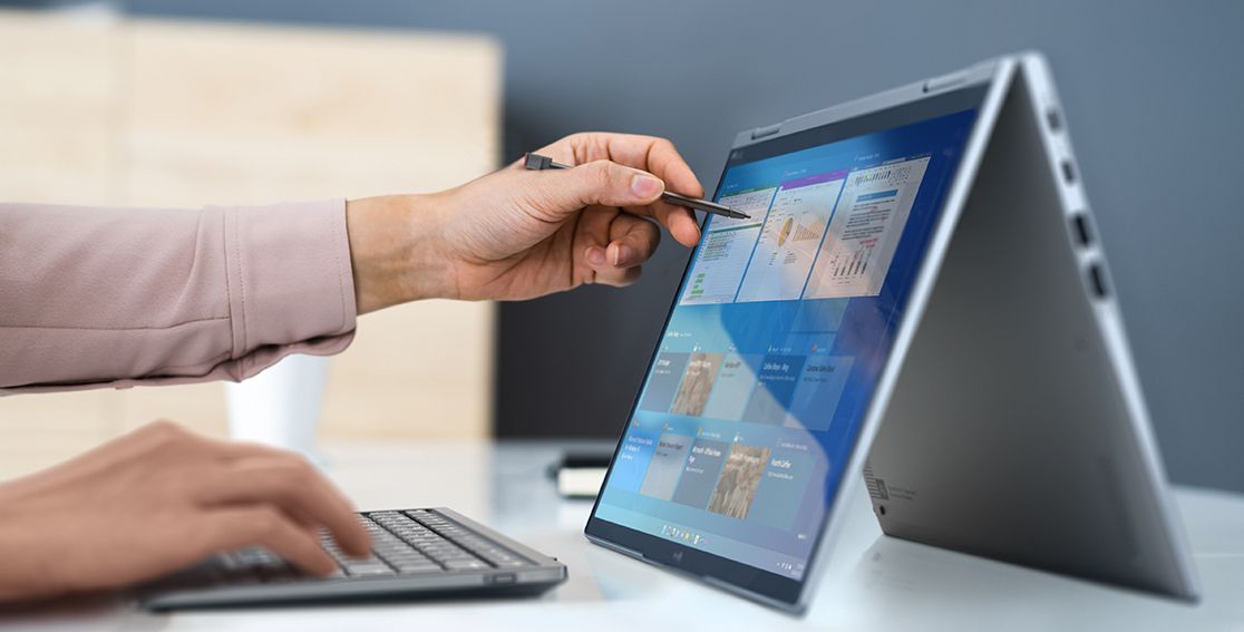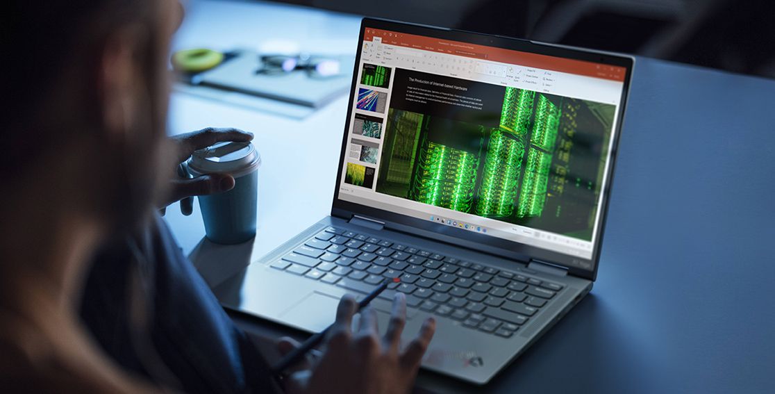Dzięki zawiasowi obracającemu się o 360 stopni laptop ThinkPad X1 Yoga Gen 8 szybko przełącza się między trybami laptopa, tabletu, namiotu i stojaka. Bez względu na to, dokąd zaprowadzi Cię praca, mamy sposób na dostosowanie się do Twojego stylu, aby pomoc w szybszym wykonywaniu zadań. Bezproblemowo przechodź od pisania na klawiaturze do szkicowania, podpisywania dokumentów lub robienia notatek na ekranie za pomocą zintegrowanego pióra. Możesz także po prostu przesunąć palcem, gdy używasz urządzenia jako tabletu.