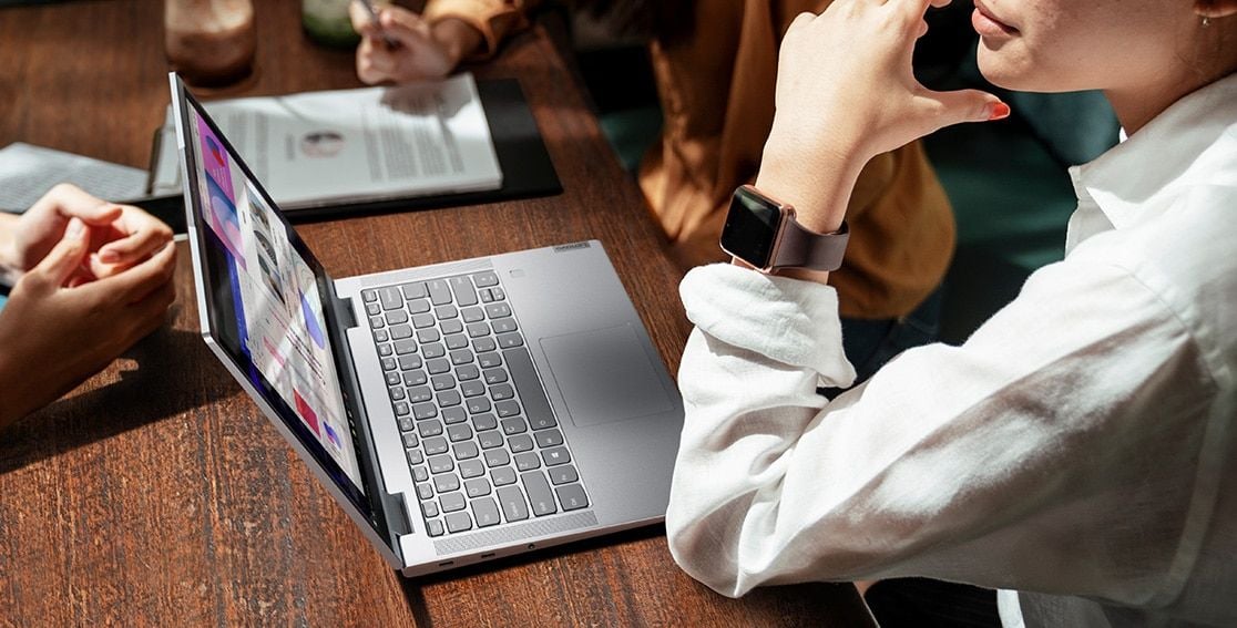 Yoga 7i (14") oszczędza Twój czas i wysiłek dzięki innowacyjnym funkcjom ze sztuczną inteligencją. Pracę możesz rozpoczynać szybciej, bo ten komputer włącza się w momencie otwarcia pokrywy. Ultrabezpieczny czytnik linii papilarnych ułatwia logowanie się. Funkcja Intelligent Cooling optymalizuje wydajność komputera w zależności od tego, co robisz. W ten sposób bateria osiąga imponujące czasy działania. Na wybranych rynkach można skorzystać głosowo z pomocy cyfrowej asystentki Alexy, która ma teraz ulepszony interfejs i rozbudowane funkcje. Tak właśnie działają inteligentniejsze technologie.