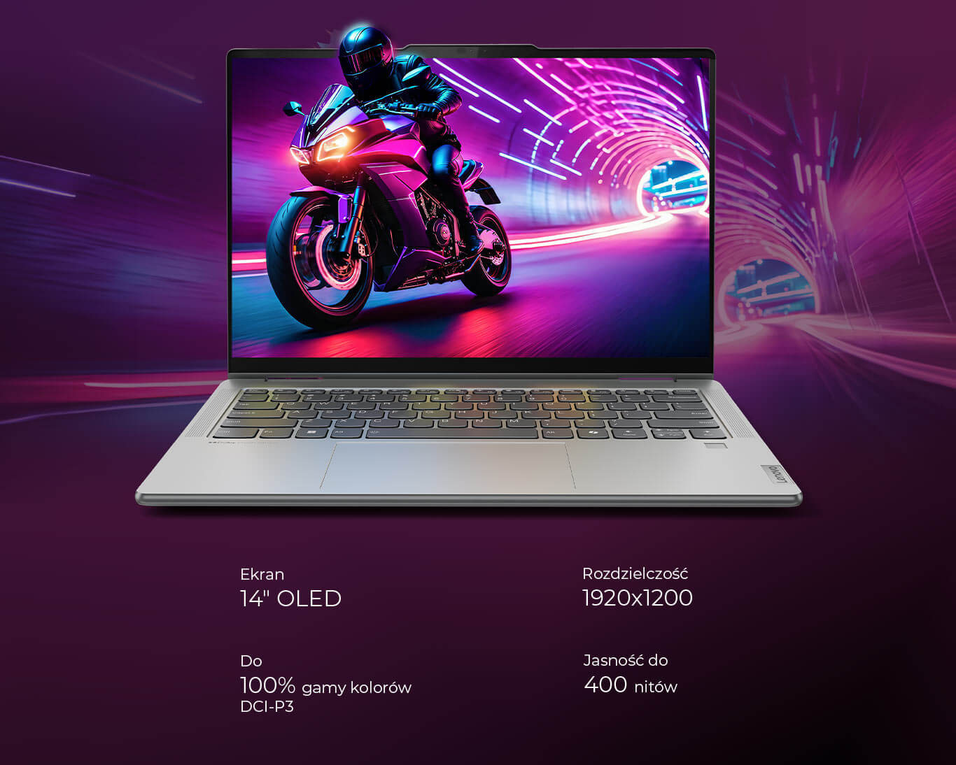 Zrealizuj każdą swoją wizję na 14‑calowym ekranie OLED z wąskimi ramkami, o proporcjach 16:10, wyświetlającym żywe i płynne obrazy z częstotliwością odświeżania 120 Hz. Dolby Vision wzmacnia każdy szczegół, zapewniając niezrównaną głębię, kontrast i blask kolorów.