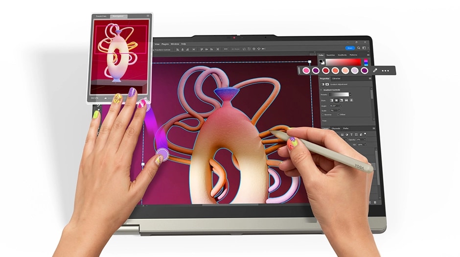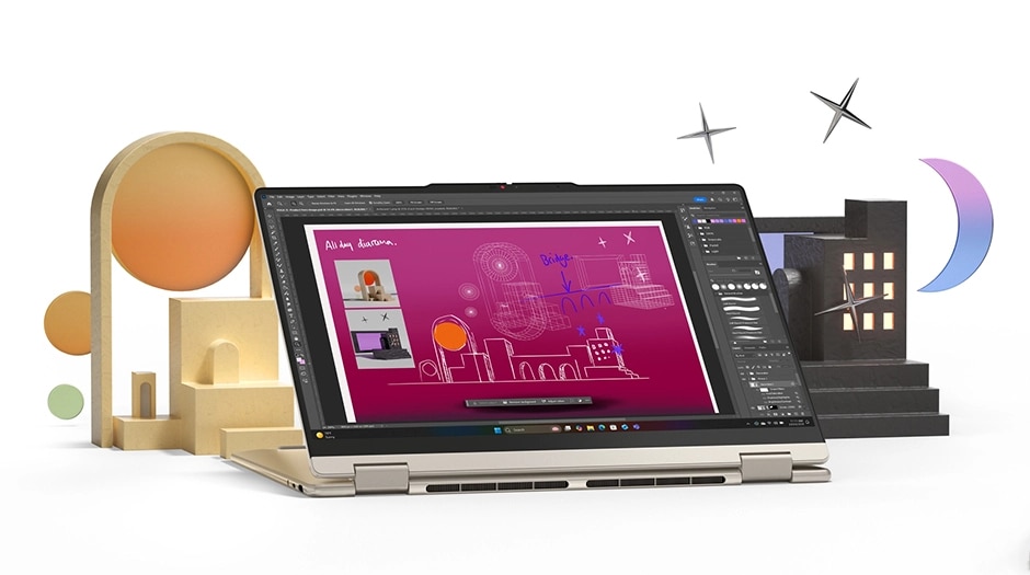 Laptop wyróżnia się wytrzymałym zawiasem, który umożliwia pełny obrót ekranu o 360 stopni, co pozwala na błyskawiczną zmianę trybu pracy w zależności od potrzeb. Możesz korzystać z trybu Canvas do szkicowania przy użyciu opcjonalnego pióra Yoga Pen, trybu namiotu do wspólnych prezentacji lub tradycyjnego trybu laptopa do pisania długich dokumentów. Smukła i elegancka obudowa sprawia, że urządzenie prezentuje się profesjonalnie w każdych warunkach, od kawiarni po salę konferencyjną. Ergonomiczne krawędzie poprawiają komfort trzymania urządzenia w trybie tabletu, minimalizując zmęczenie dłoni podczas długich sesji twórczych.