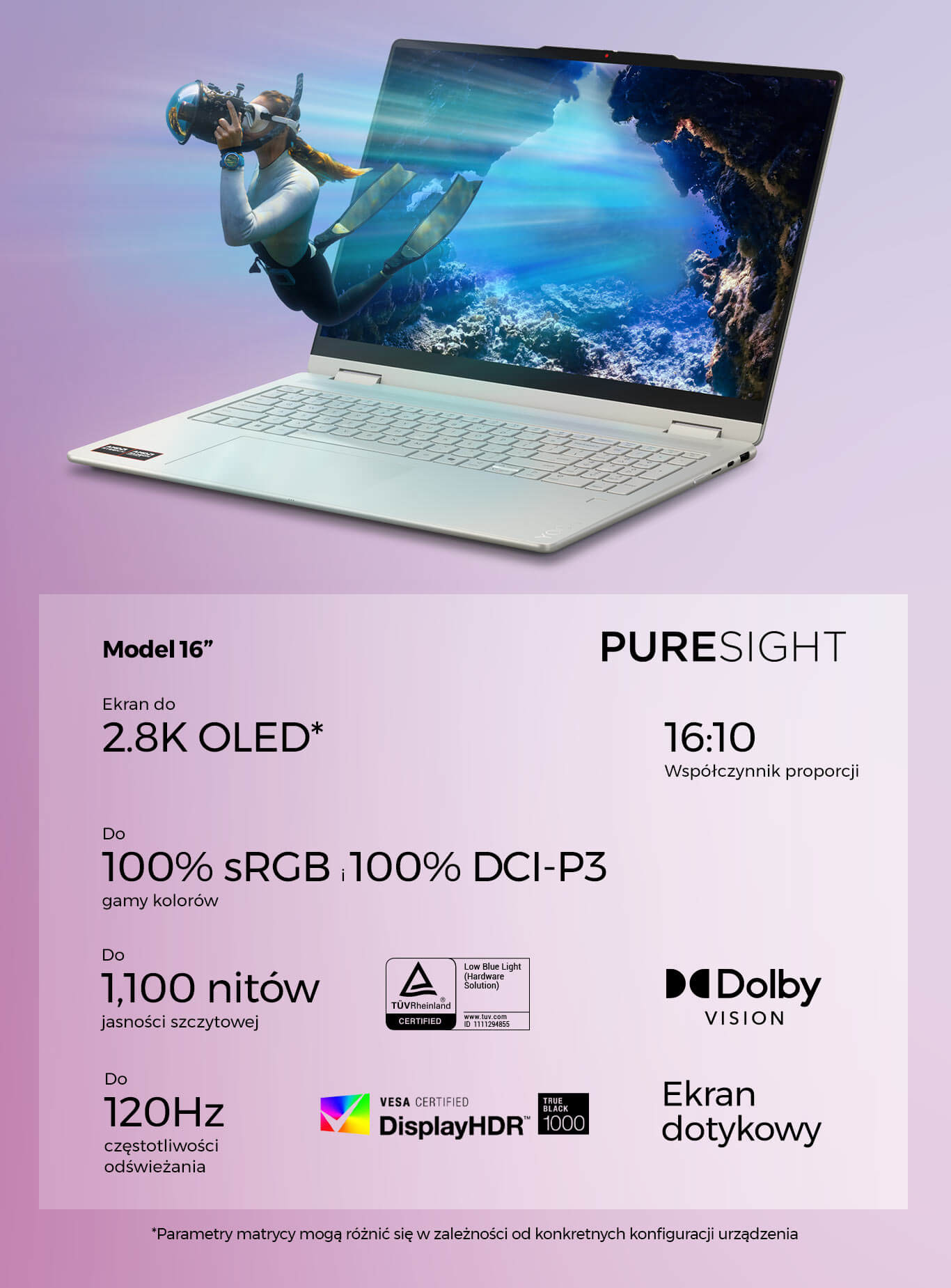 Od treści HDR po projekty wymagające olśniewających kolorów, każdy piksel na matrycy PureSight OLED jest odwzorowany z realistyczną perfekcją. Szczytowa jasność na poziomie 1100 nitów gwarantuje niesamowitą szczegółowość detali oraz wyraźny obraz niezależnie od oświetlenia jakie nas otacza.