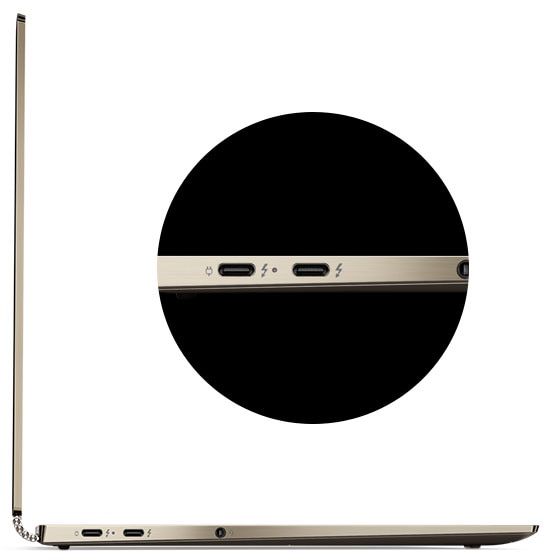 Laptop Yoga 920 został wyposażony w dwa porty Thunderbolt™ 3 porty USB typu C — rewolucyjną technologię obsługującą ekrany o wysokiej rozdzielczości, wysokowydajne urządzenia do magazynowania danych i oferującą możliwość szybkiego ładowania. Podłącz laptopa do wielu ekranów, a następnie synchronizuj i archiwizuj dane z prędkością do 40 Gb/s — osiem razy szybciej niż przez USB 3.0!