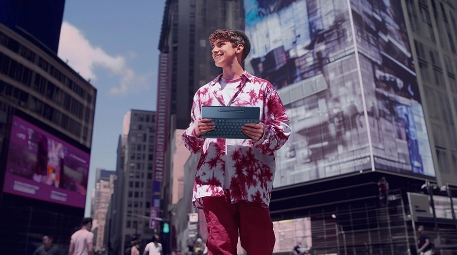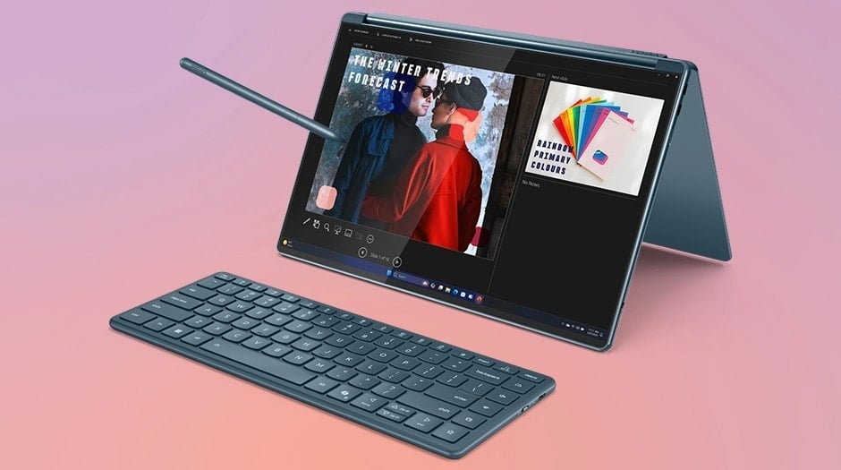 Laptop Yoga Book 9i (14″ Intel) wyróżnia się nie tylko swoją funkcjonalnością, ale również eleganckim wyglądem. Wykończony w stylowym kolorze Tidal Teal i zaprojektowany z myślą o komforcie użytkowania (Comfort Edge), jest wygodny w noszeniu i użytkowaniu. Jego niewielka waga (zaledwie 1,22 kg) czyni go najcieńszym i najlżejszym na świecie dwuekranowym laptopem konwertowalnym z tak pojemną baterią*, co podkreśla jego wyjątkowość.