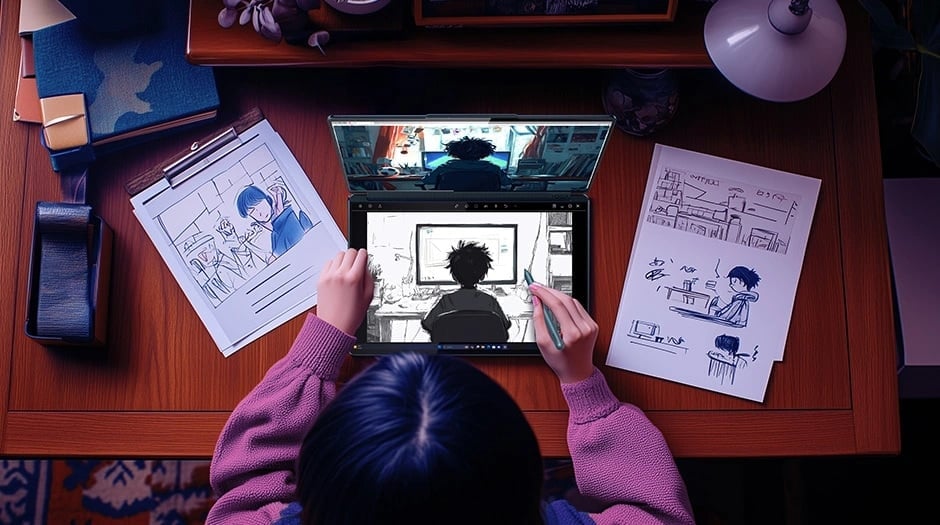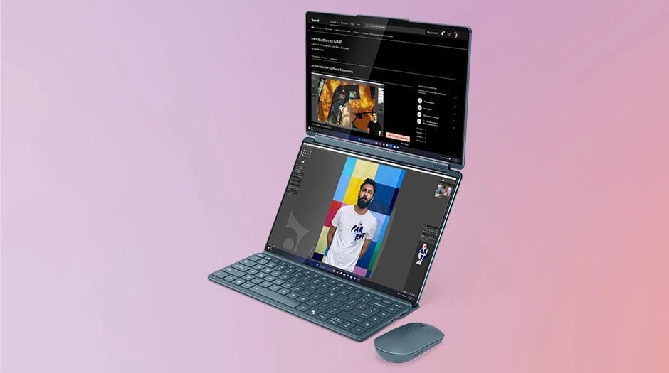 Dwa ekrany Yoga Book 9i otwierają nowe możliwości w zakresie łączności i rozrywki. Możesz jednocześnie prowadzić transmisje na żywo i zarządzać swoimi mediami społecznościowymi na jednym ekranie, mając jednocześnie uporządkowane planowanie treści i notatki na drugim. W czasie wolnym możesz łatwo przełączyć laptop w tryb tabletu i zanurzyć się w ulubionych filmach, grach lub e-bookach, niezależnie od miejsca, w którym się znajdujesz.
