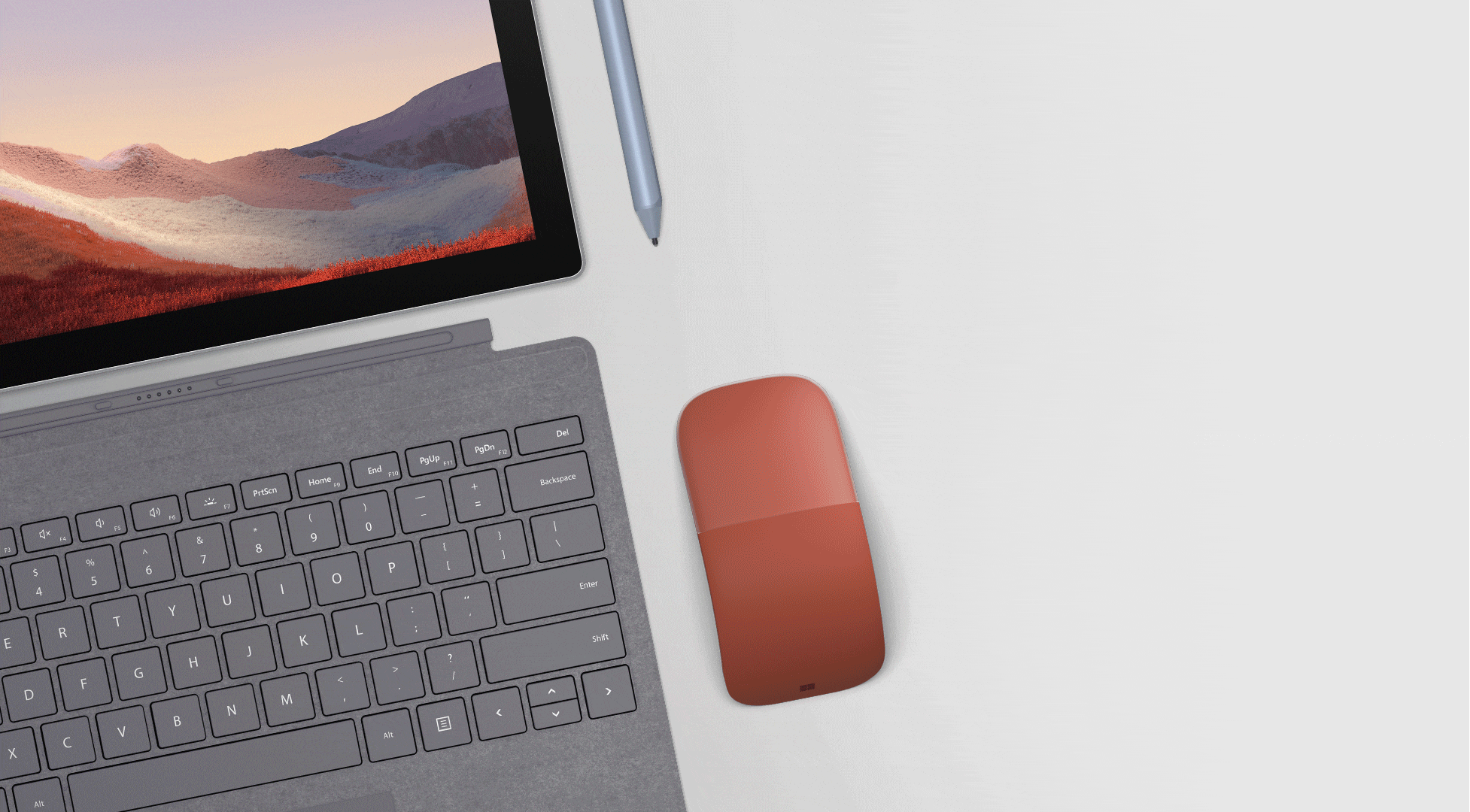Aby wszędzie korzystać z cech laptopa, spersonalizuj swoje urządzenie Surface Pro 7 dzięki Dokupowanym osobno klawiaturze Signature Type Cover, piórze Surface Pen, a także myszy Surface Arc dostępnych w szerokiej gamie kolorów, które możesz dowolnie łączyć.