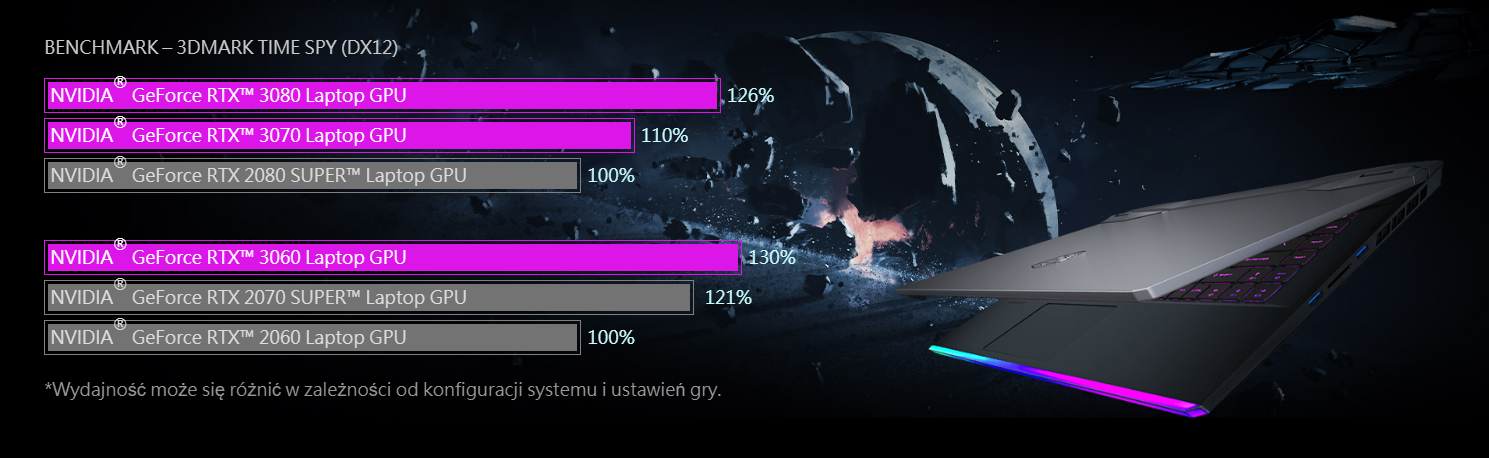 Procesory graficzne z serii GeForce RTX™ 30 stanowią podstawę do budowy najszybszych na świecie laptopów dla graczy i twórców. Układy te bazują na architekturze Ampere, czyli na drugiej generacji architektury RTX firmy NVIDIA, która charakteryzuje się nowymi rdzeniami RT, rdzeniami Tensor oraz procesorami strumieniowymi, zapewniającymi najbardziej realistyczną grafikę generowaną z wykorzystaniem technologii ray tracingu. Oferują one najnowocześniejsze funkcje oraz wykorzystują algorytmy sztucznej inteligencji.
