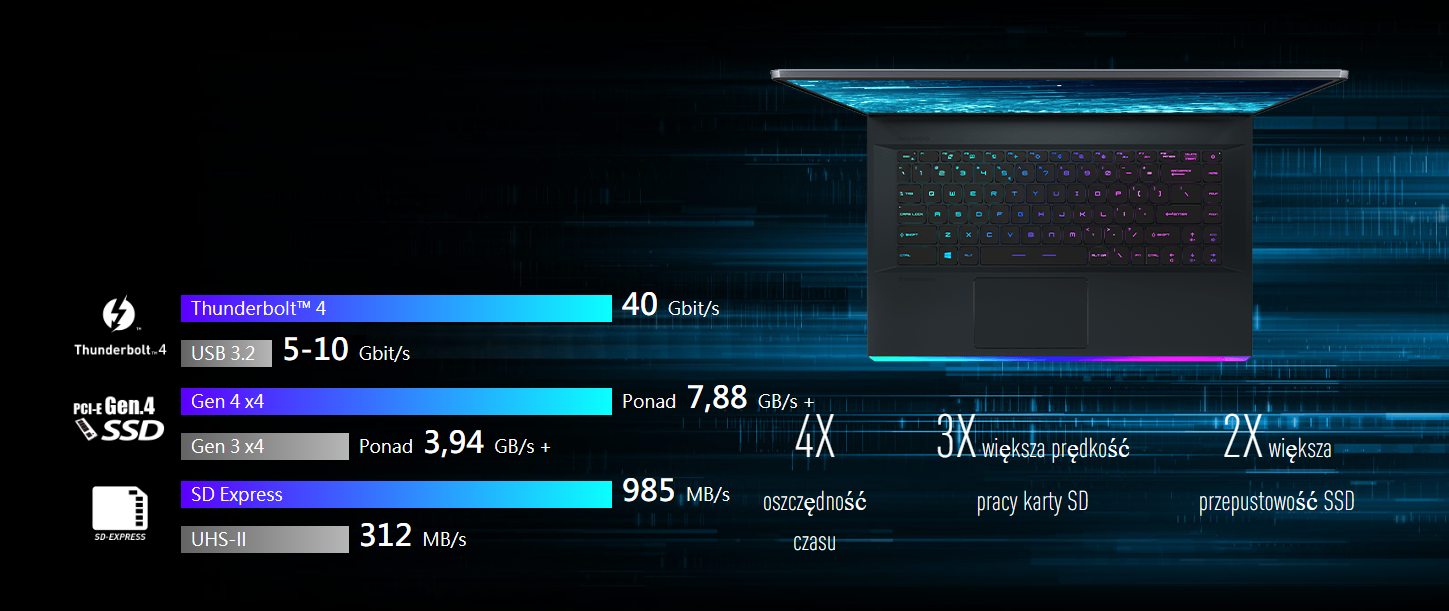 11. generacja mobilnej platformy Intela oferuje nowej generacji przepustowość magistrali PCIe Gen4 x16, maksymalizując tym samym gamingową wydajność kart graficznych z serii GeForce RTX 30, przyspieszając obliczenia i szybkość przetwarzania danych przez algorytmy sztucznej inteligencji.