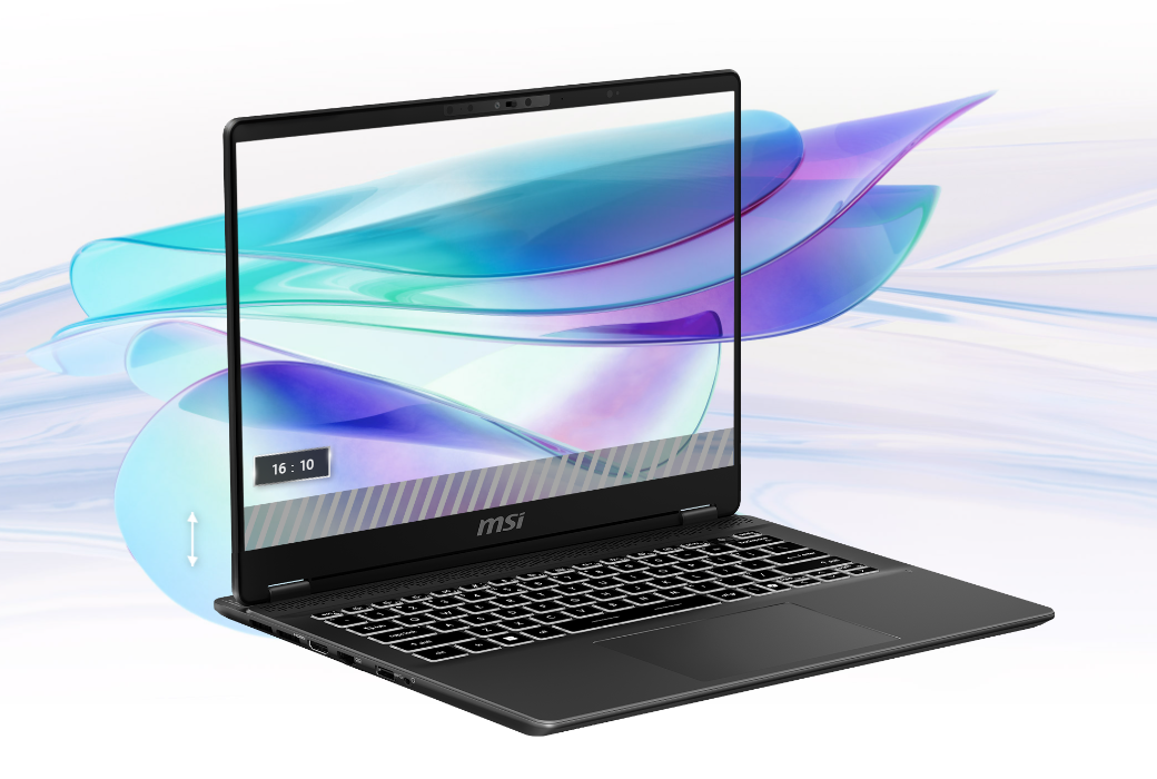 Laptopy z serii Prestige 14 AI Evo C1M charakteryzują się bardzo wąskimi ramkami wokół ekranu i wyświetlaczem o proporcjach 16:10. Dzięki temu uzyskano dużo większą przestrzeń roboczą w porównaniu do standardowych wyświetlaczy 16:9. W ten sposób udało się zwiększyć produktywność, ułatwić czytanie tekstów i usprawnić pracę z arkuszami kalkulacyjnymi.