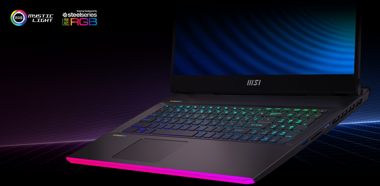 Panoramiczny system podświetlenia Mystic Light, niczym zorza polarna, rozciąga się na całej przedniej krawędzi obudowy laptopa. Został on zaprojektowany tak, aby zapewnić użytkownikom, jak najlepszą możliwość dopasowania podświetlenia RGB do rozgrywającej się na ekranie akcji. Możesz cieszyć się precyzyjną kontrolą podświetlenia, tworząc praktycznie nieograniczone kombinacje barw, wybierając je spośród 16,8 milionów kolorów.