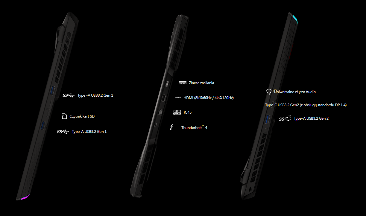 Raider GE77 HX wyposażony jest w najbardziej kompletny zestaw portów We/Wy, które pozwalają na obsługę wszelkich stosowanych obecnie systemów i standardów transmisji danych lub wyjść sygnału wideo. W ten sposób zapewniono graczom maksymalną elastyczność w wykorzystaniu laptopa.