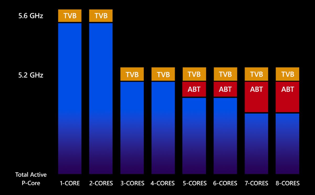 Technologia Intel® ABT (Adaptive Boost Technology) poprawia wydajność systemu dzięki temu, że umożliwia w trybie Turbo wielu rdzeniom na pracę z o wiele wyższą częstotliwością. Z kolei Intel® TVB (Thermal Velocity Boost) zwiększa częstotliwość zegara nawet o 100MHz.