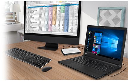 Wbudowane złącze USB Type-C™, obsługujące zarówno interfejs Display Port, jak i zasilanie, umożliwia proste dokowanie laptopa przy użyciu jednego kabla, co ułatwia zapisywanie, przechowywanie i udostępnianie danych. Ponadto dzięki portom HDMI, RGB, USB 3.0 oraz LAN można bez trudu podłączać urządzenia peryferyjne również bezpośrednio.