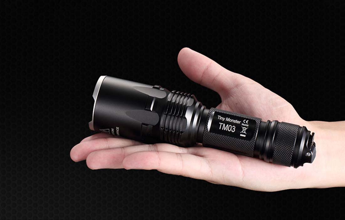 Do wykonania latarki zastosowano wysokiej klasy aluminium lotnicze o grubości 4,5 mm. Dzięki temu TM03 jest niesamowicie wytrzymała, a zarazem lekka i poręczna. Waży zaledwie 213 g i jest niezwykle wygodna w obsłudze. Świetnie leży w dłoni, a jej przyciski zostały umieszczone w łatwo dostępnym miejscu.