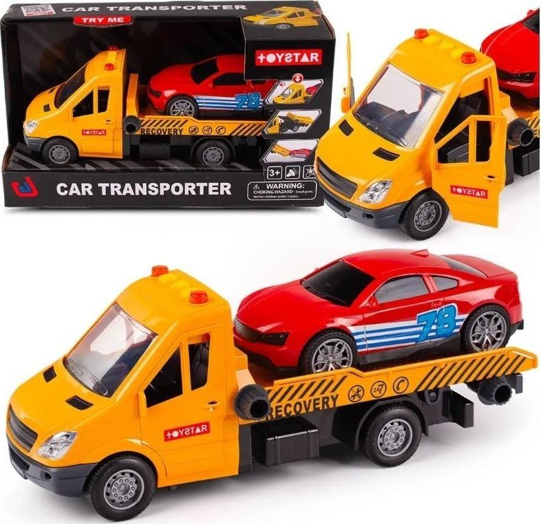 Zestaw pojazdów, który składa się z samochodu ciężarowego lawety na której znajduje się samochodzik sportowy. Zestaw idealny dla każdego chłopca trzylatka. Zabawkowy bus laweta pomoc drogowa posiada wiele ruchomych elementów a także efekty świetlne i dźwiękowe. Pojazd wykonany został z dbałością o szczegóły i detale, dzięki czemu bardzo dobrze odzwierciedla prawdziwy pojazd pomocy drogowej. Jeżeli Twoje dziecko uwielbia samochody, ciężarówki i pojazdy to ta zabawka jest właśnie dla niego. Świetnie uzupełni tradycyjne autka czy pojazdy budowlane. Ten pojazd dla dzieci zajmie Twojego urwisa na długie godziny zabawy!