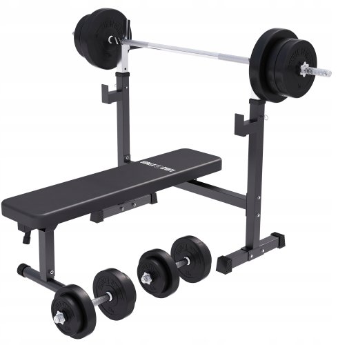 Ławka szeroka pod sztangę 3w1 zestaw bitumiczny 70 kg, sztanga i hantle