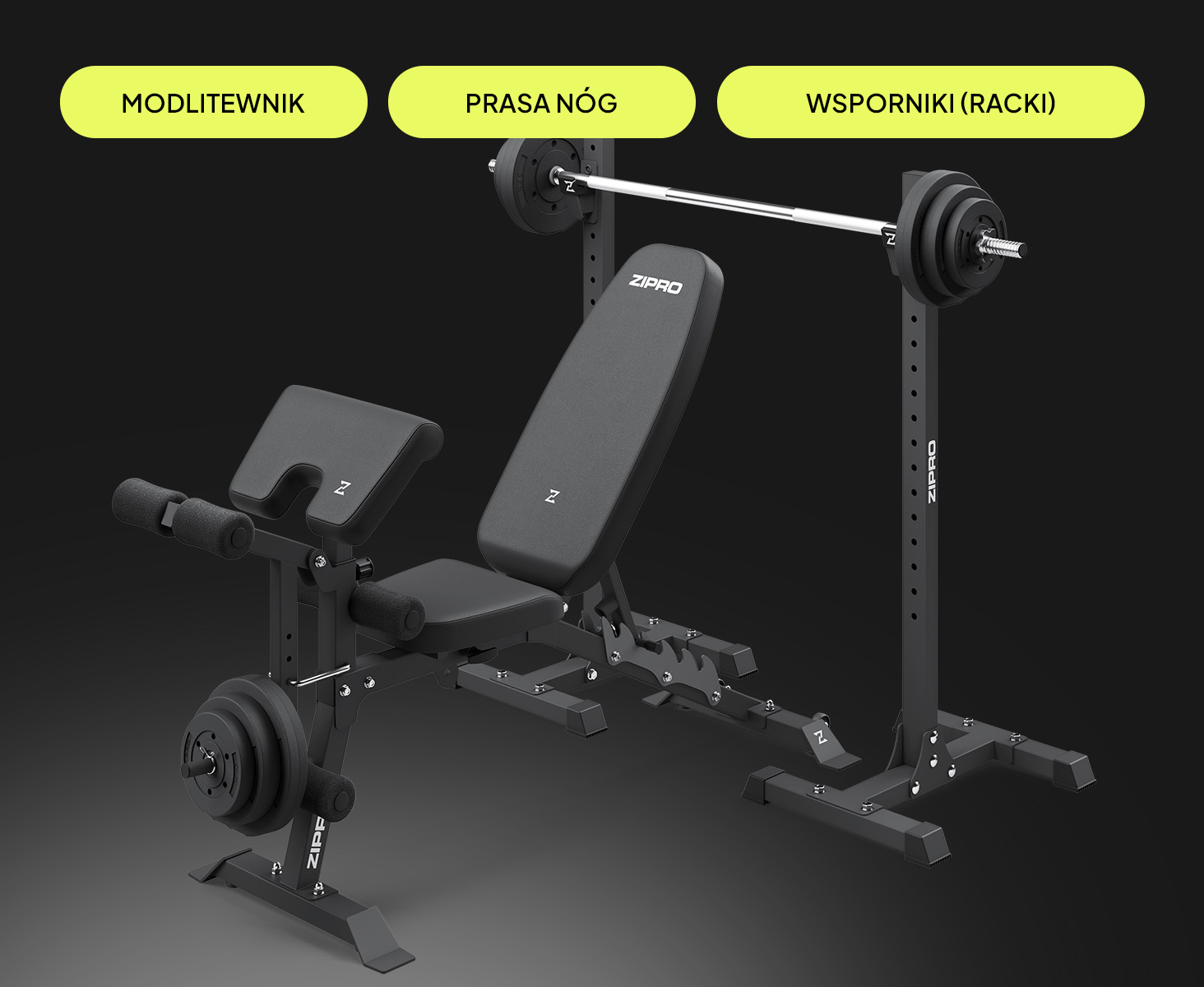 Ławka ZIPRO Superset to przyrząd do ćwiczeń, przy pomocy którego można wykonać nawet bardzo wszechstronny trening. Prasa do nóg pozwala ćwiczyć łydki i uda. Modlitewnik to narzędzie wspierające trening mięśni rąk, a wyciskanie sztangi to jedno z najlepszych ćwiczeń wzmacniających mięśnie klatki piersiowej.