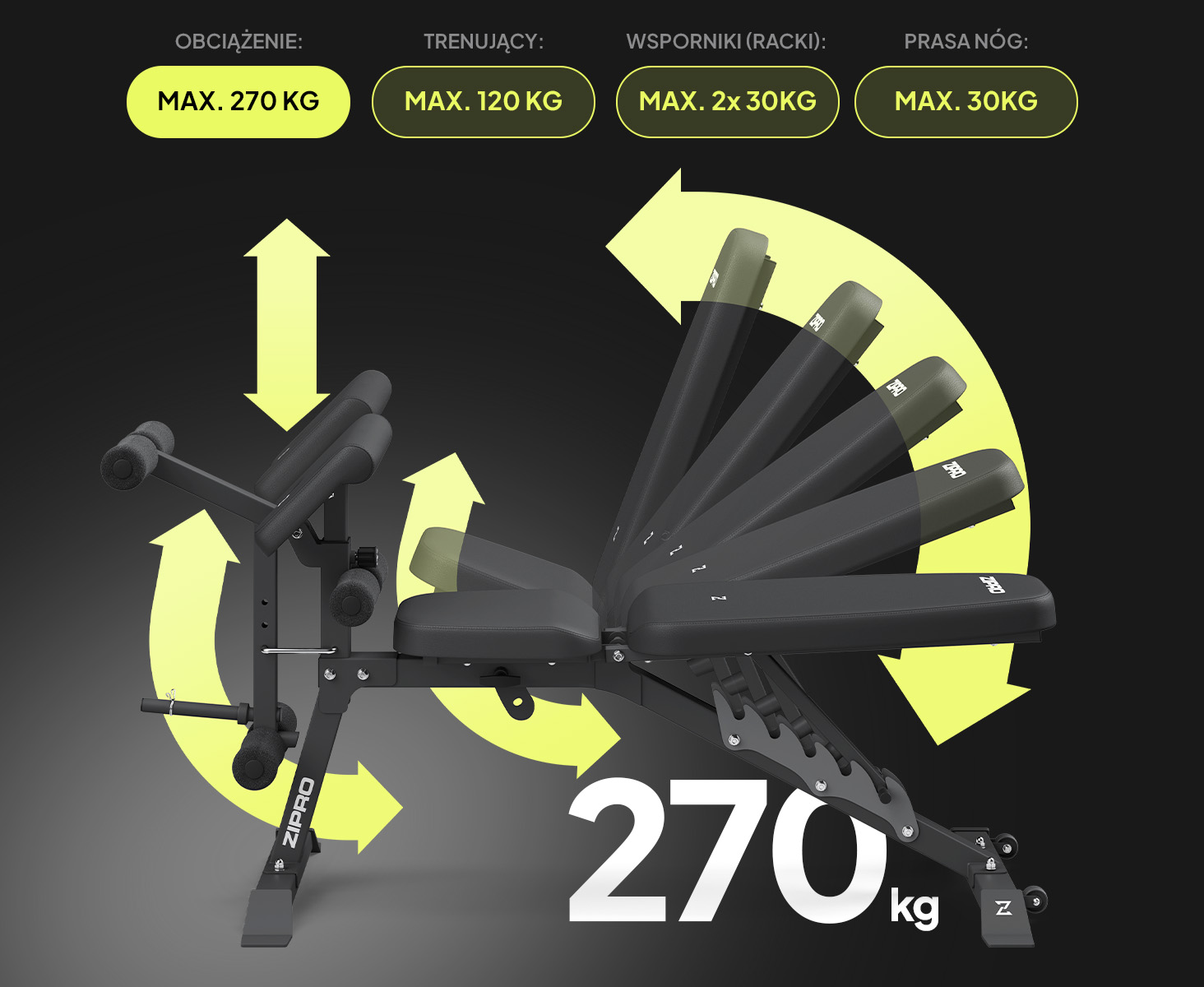 - 270 kg maksymalny całkowity udźwig ławki (w tym 120 kg maksymalna waga użytkownika)