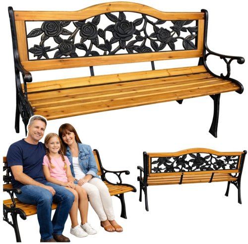 Ławka wyróżnia się harmonijnym zestawieniem ciepła drewna z metalową, ozdobną ramą. To połączenie sprawia, że ławka staje się nie tylko meblem, ale również stylowym elementem dekoracyjnym.