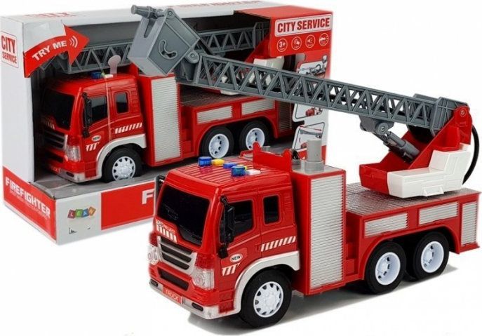 Czerwony wóz strażacki posiada regulowaną drabinę, którą można poruszać w górę i w dół, a także wydłużać ją i skracać. Na końcu drabiny znajduje się platforma z końcówką węża strażackiego, z której leci woda! Jest to możliwe dzięki zbiornikowi umieszczonemu na początku przyczepy pojazdu. Po odczepieniu zatyczki i napełnieniu zbiorniczka wodą .