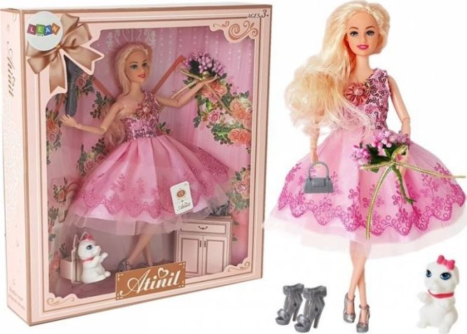 Prezentowany zestaw to wspaniała propozycja dla małych dziewczynek, które uwielbiają zabawę lalkami oraz interesują się modą, mają w swojej szafie dużo ubrań i często się przebierają. Zestaw składa się z imponującej liczby akcesoriów — w środku znajduje się piękna, jasnowłosa lalka w jasnoróżowej sukni z kokardą. Dodatki takie jak: szpilki, torebka, szczotka, piesek oraz kwiaty dodadzą szyku i klasy. Idealna na imprezę lub bal i aby pokazać się na scenie przed światłami reflektorów. Twarz lalki ozdobiona jest kobiecym, delikatnym makijażem. Na wielki wybieg na pokazie mody lub odebranie nagrody na pewno zrobi wrażenie. To twoje dziecko zdecyduje jak zabawa będzie wyglądać