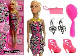 Przedstawiamy piękną lalkę z akcesoriami ubraną w kolorową sukienkę oraz pantofelki. Lalka posiada długie włosy i piękne brązowe oczy. Posiada ruchome ręce, nogi i głowę. Od dawna laleczki są ulubienicami naszym małych pociech. Do zestawu dołączone są akcesoria. Szczotka do włosów, aby stylizować różnego rodzaju fryzury. Kolczyki i torebka mogą stanowić dodatkowe elementy stylizacji. Nasza lalka bardzo ładnie prezentuje się w całej sterylizacji.