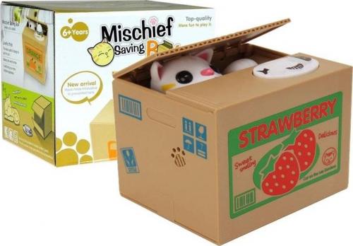 Naciśnij przycisk na budce a kot dźwignie pokrywkę i łapką wciągnie pieniążka.