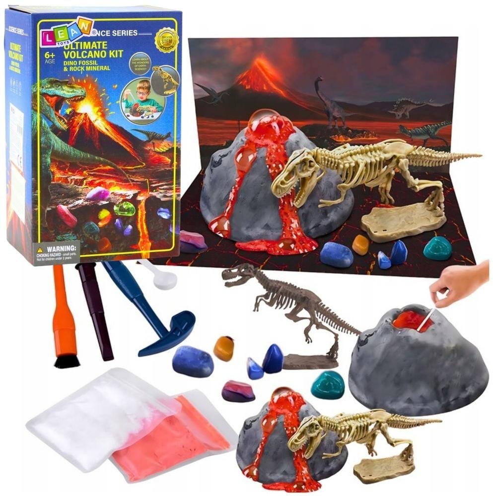 ZABAWKI EDUKACYJNE DLA DZIECI - MAŁY CHEMIK WULKAN I DINOZAURY ZESTAW Zestaw edukacyjny Wybuchowy Wulkan i Dinozaury to niezwykła propozycja dla dzieci, które z pasją odkrywają świat nauki, eksperymentów i tajemnic przeszłości. Ten bogato wyposażony zestaw pozwala młodym odkrywcom wcielić się w rolę prawdziwych naukowców i archeologów, umożliwiając im przeprowadzenie spektakularnej erupcji wulkanu oraz ekscytujących wykopalisk skamieniałości. To fascynująca zabawa 2w1, która nie tylko dostarcza emocji, ale również rozwija i uczy - a wszystko to w bezpiecznych, domowych warunkach. Zabawa z zestawem to doskonałe połączenie nauki i rozrywki - dzieci uczą się podstaw chemii, geologii i paleontologii w praktyczny, przystępny sposób. Obserwowanie reakcji chemicznej podczas wybuchu wulkanu oraz poszukiwanie skamielin w odlewie wulkanicznym rozwija logiczne myślenie, zdolności manualne, cierpliwość i koncentrację. To również świetny trening koordynacji i precyzji. Starannie dobrane materiały oraz instrukcja krok po kroku sprawiają, że dziecko może samodzielnie i bezpiecznie przeprowadzić wszystkie etapy zabawy - od eksperymentu chemicznego po złożenie szkieletu dinozaura. To także świetny pomysł na prezent dla każdego ciekawego świata młodego naukowca! SPECYFIKACJA: Rodzaj: zestaw edukacyjny - eksperymenty chemiczne i archeologiczne Motyw: wulkan i dinozaury Wymiary opakowania: 21 x 13 x 9,5 cm Szerokość produktu: 9,5 cm Materiał: tworzywo sztuczne, gips, bezpieczne składniki chemiczne ZAWARTOŚĆ ZESTAWU: Gipsowy odlew wulkanu Kwas cytrynowy Wodorowęglan sodu Miarka Strzykawka Mieszadło Kubeczek miarowy Młotek Dłuto Pędzelek Teksturowa ilustracja wulkanu Obrazkowa instrukcja Ozdobne opakowanie