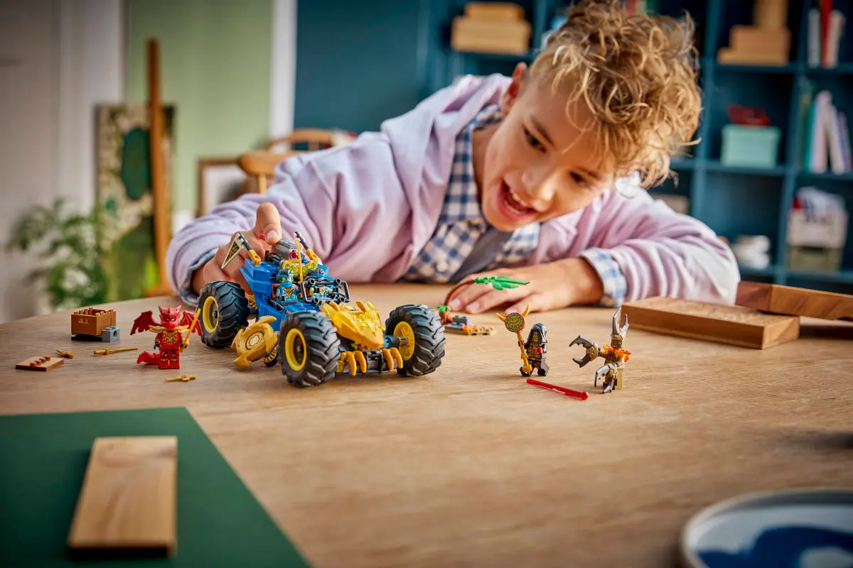 Dzięki zestawowi konstrukcyjnemu LEGO® NINJAGO® Wielofunkcyjny samochód Jaya (71856) chłopcy i dziewczynki w wieku od ośmiu lat mogą cieszyć się godzinami szybkiej akcji. Ten samochód wyścigowy 2 w 1 można zbudować w dwóch wersjach: w trybie normalnym lub, po odwróceniu przedniej części, w trybie smoka, który odsłania złote pazury, głowę smoka i obracające się shurikeny. Ten fajny model dla dzieci ma sprężynowe działko z dwiema strzałkami, które można odczepić i umieścić na pokrytym roślinnością dodatkowym modelu, aby odgrywać bitwy. Zestaw zawiera pięć minifigurek LEGO NINJAGO: Jaya, Nyę i Kaia w smoczej formie, a także nikczemnego ziemnego potwora i przywódcę lojalistów, do zabawy w walkę dobra ze złem. Seria zestawów i zabawek LEGO NINJAGO dla dzieci obejmuje mechy, smoki i świątynie, dzięki którym fani mogą odgrywać scenki z udziałem ninja. Dzieci mogą budować z pewnością siebie, korzystając z aplikacji LEGO Builder, w której można powiększać modele, obracać je w 3D i śledzić postępy dzięki prostym instrukcjom cyfrowym. Zestaw składa się z 387 elementów.