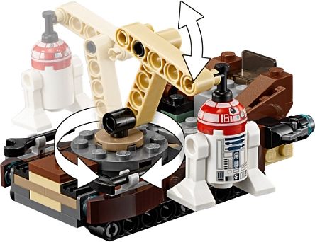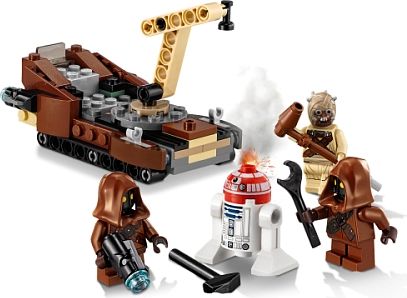 ![]() | W zestawie trzy minifigurki: dwóch Jawów i Tusken, a także droid astromechaniczny. Pojazd serwisowy ma dwa miotacze klocków i przegubowy dźwig do podnoszenia dołączonego droida astromechanicznego. Broń: dwa blasterowe miotacze klocków Jawów i kij gaffi Tuskena. |