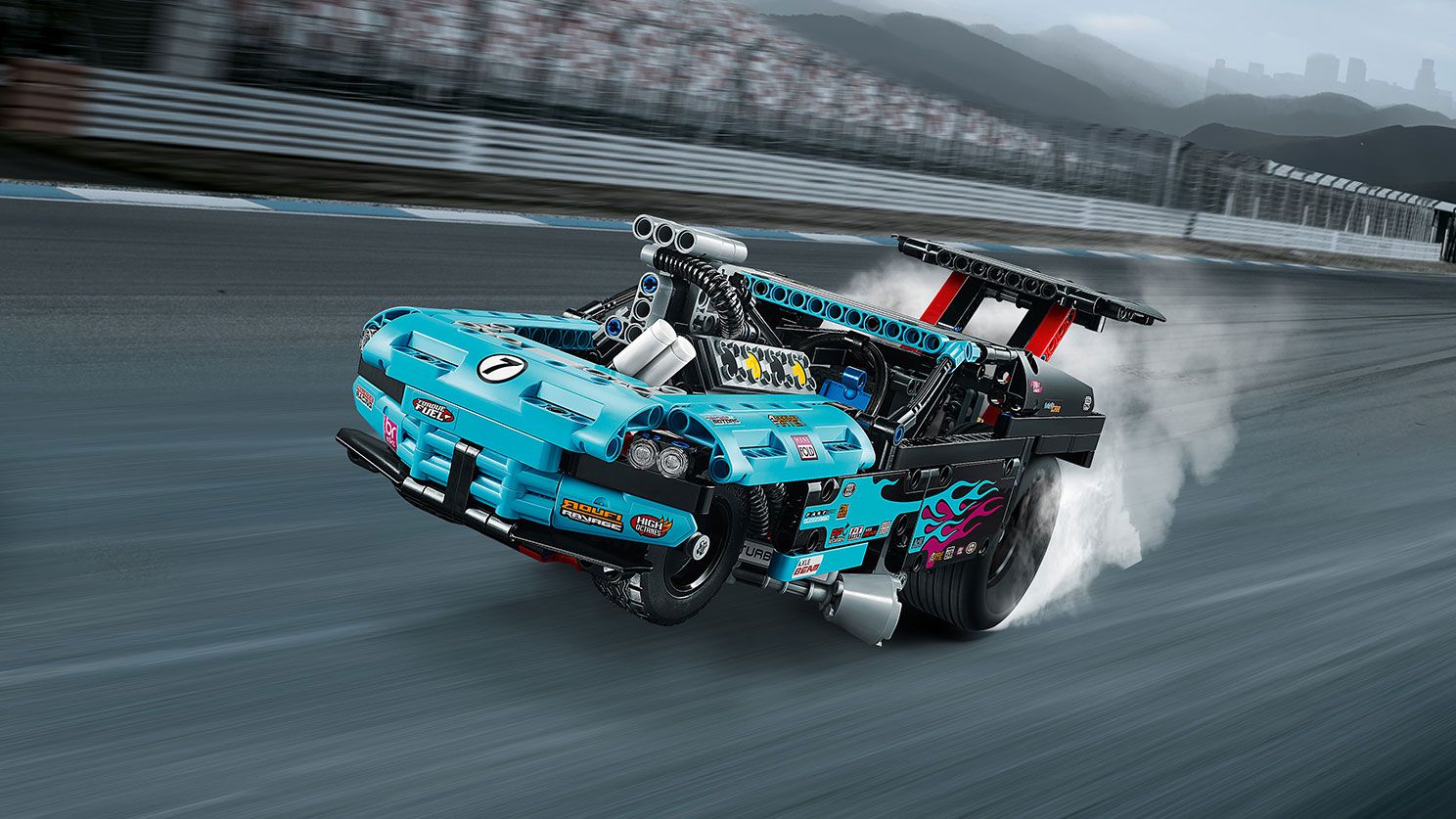 Potężny Dragster całą trasę wyścigu pokonuje z przednimi kołami w górze — jakby miał zaraz odlecieć! Model jest utrzymany w kolorach czerni i żywego błękitu i ma ekstra naklejki z płomieniami, pracujący układ kierowniczy oraz silnik V8 z ruchomymi tłokami. Pod maską tego modelu „2 w 1” z zestawu LEGO® Technic kryją się mechanizmy podwozia, rury wydechowe i pracująca skrzynia biegów. Rozbuduj model o funkcje Power Functions z zestawu 8293 (dostępny osobno), które dadzą mu napęd do jazdy na tylnych kołach! Możliwość przebudowania modelu na dragstera z doładowaniem daje podwójną porcję zabawy. | ![]() |