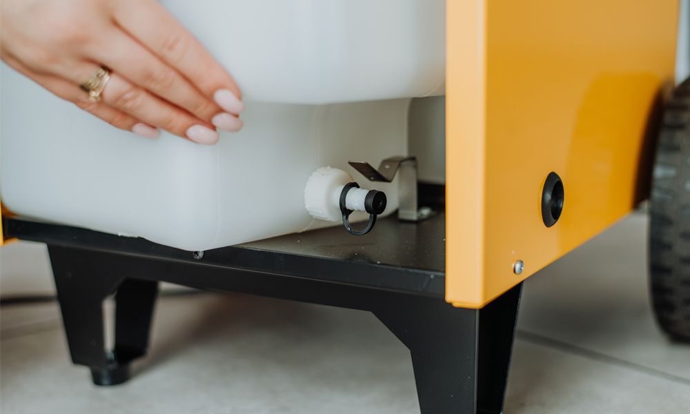 Nasz osuszacz powietrza działa wykorzystując efekt rosy - pochłaniacz zasysa powietrze, dzięki zamontowanemu wentylatorowi i skrapla parę wodną, następnie woda trafia do zbiornika lub jest odprowadzana np. do kanalizacji.