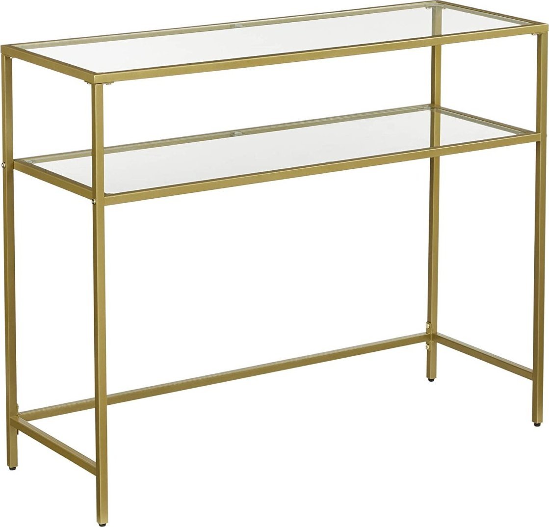 Konsola wykonana ze szkła i metalu malowanego proszkowo na kolor złoty. Produkt tworzy niesamowitą dekorację Twojego pomieszczenia. Półki konsoli są stabilne, a więc możemy umieścić na nich książki, kwiaty w wazonach, ozdobne figurki, dziecięce zabawki oraz ramki ze zdjęciami. Odpowiednie wymiary konsoli zapewniają wystarczająco dużo miejsca na nasze rzeczy.