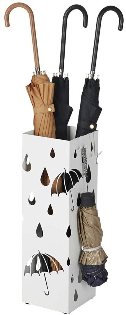 Parasolnik wykonano z wytrzymałej stali malowanej proszkowo, co gwarantuje jego stabilność oraz długotrwałe użytkowanie. Solidna konstrukcja sprawia, że stojak jest nie tylko trwały, ale także wszechstronny – z powodzeniem przechowa nie tylko parasole, ale również inne przedmioty, takie jak kije do nordic walking. W zestawie znajdują się także cztery praktyczne haczyki, na których można zawiesić mniejsze, składane parasolki.