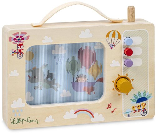 Pozytywka w formie telewizora oferuje ruchome postacie zwierząt, takich jak smok, lisiczka i jeżyk, które poruszają się na ekranie. Zabawka wyposażona jest w pokrętło do nakręcania melodii oraz przyciski, a także antenkę i uchwyt do przenoszenia. Wykonana z drewna, malowana bezpiecznymi farbami na bazie wody, zapewnia bezpieczeństwo użytkowania.