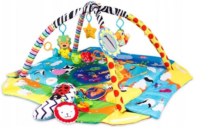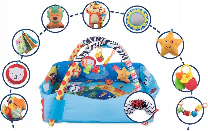 Mata edukacyjnaBoki maty można podnosić i opuszczać, a pałąki montować w różnych konfiguracjach, co pozwala dopasować przestrzeń do dziecka oraz wprowadzać zmiany, by uniknąć monotonii. Funkcja KojcaDzięki podnoszonym bokom i rzepom umieszczonym na jej rogach matę można przerobić w wygodny kojec, Żywa kolorystykaZastosowanie intensywnych, kontrastujących ze sobą kolorów stymuluje zmysł wzroku małego odkrywcy, a co za tym idzie rozwija jego wyobraźnię i umiejętność koncentracji.