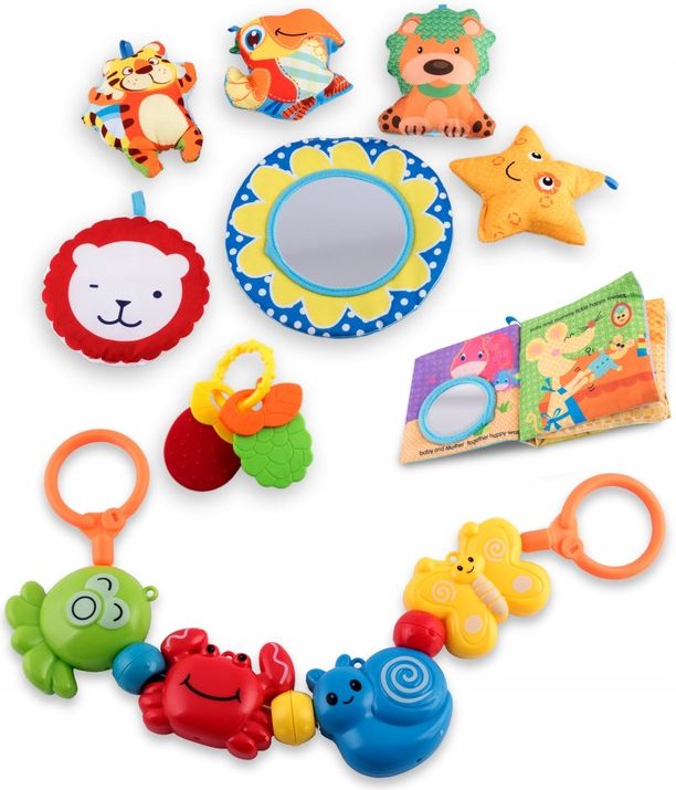ZabawkiBogaty zestaw zabawek rozwija zdolności motoryczne i manualne. Zabawki o różnych kształtach i kolorach posiadają dodatkowe funkcje - poszczególne elementy szeleszczą przy dotyku, piszczą i grzechoczą.