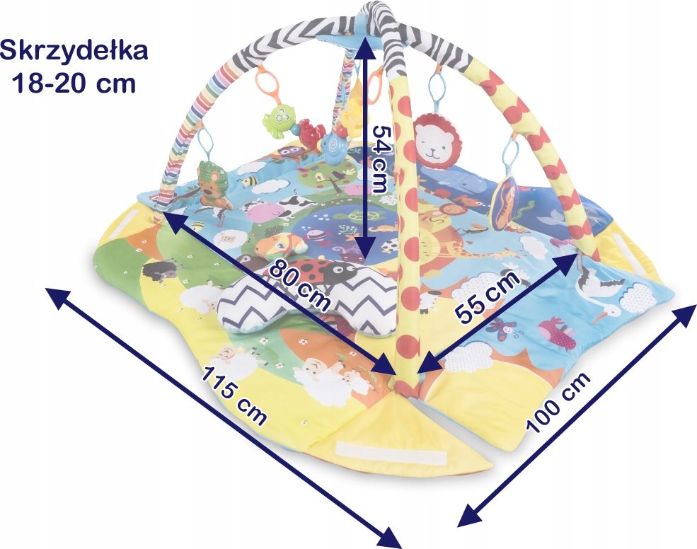 Zastosowanie intensywnych, kontrastujących ze sobą kolorów stymuluje zmysł wzroku małego odkrywcy, a co za tym idzie rozwija jego wyobraźnię i umiejętność koncentracji. Spód maty wykonany jest ze specjalnego grubego materiału, co daje doskonałą izolację termiczną od podłoża. Miękkie wypełnienie sprawia, że leżenie na macie jest bardzo wygodne dla maluszka.
