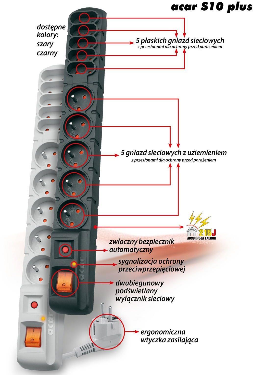 Listwa zasilająca Acar S10 Plus przeciwprzepięciowa 10 gniazd 3 m czarna (W0121)