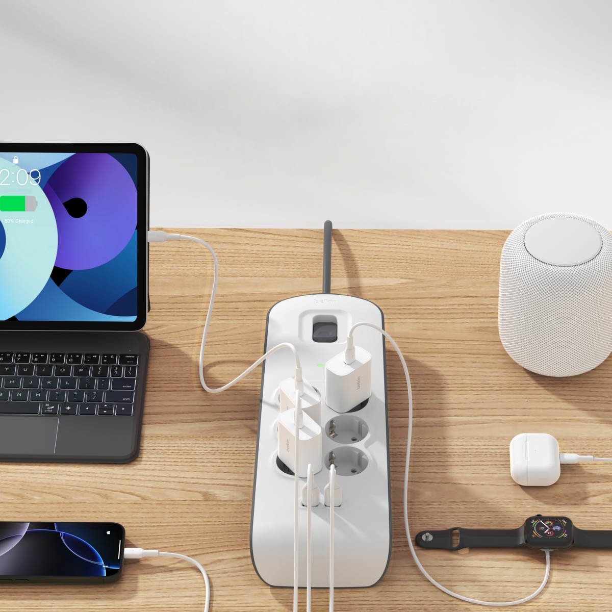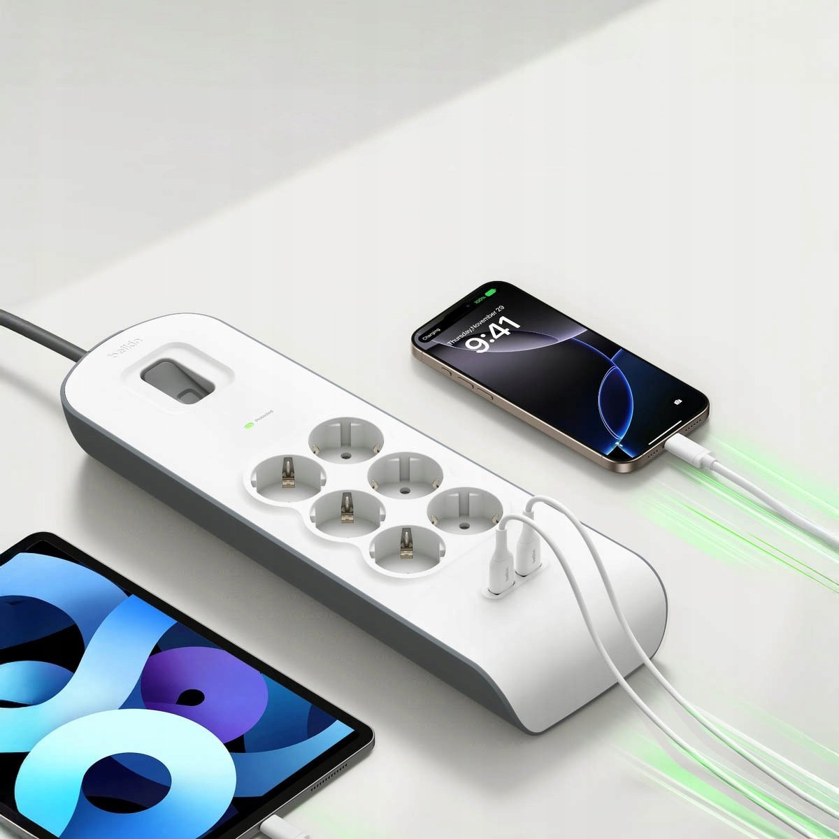 Chroń elektronikę przed przepięciami i skokami napięcia za pomocą listwy zasilającej Belkin SurgePlus, wyposażonej w sześć gniazd sieciowych (typu F - tzw. Schuko) oraz dwa porty ładujące USB-A. Podłącz listwę antyprzepięciową do dowolnego gniazdka w ścianie, a następnie do niej do maksymalnie 8 urządzeń. Będą one chronione przed przepięciami, wyładowaniami atmosferycznymi i zakłóceniami.