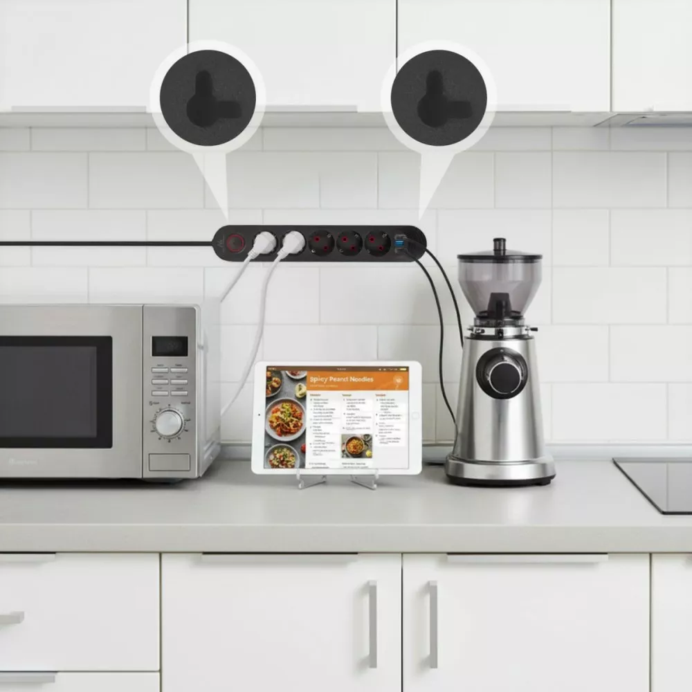Świetnie sprawdzi się na biurku, pod stołem lub w pobliżu telewizora, gdzie liczy się czysty wygląd i łatwy dostęp do zasilania.