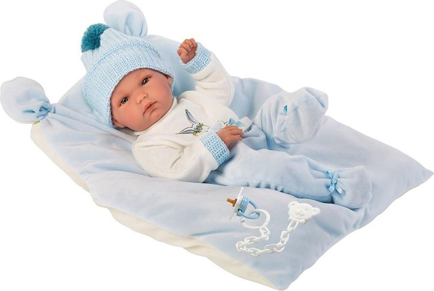 Lalka jest cała wykonana z delikatnego w dotyku winylu i ma zaznaczoną płeć chłopca. Częścią wyposażenia lalki jest duża, błękitna poduszka, która może posłużyć jako miejsce gdzie lalka śpi. Lalka została zapakowana w ozdobny karton. Kochamy hiszpańskie lalki Llorens! |