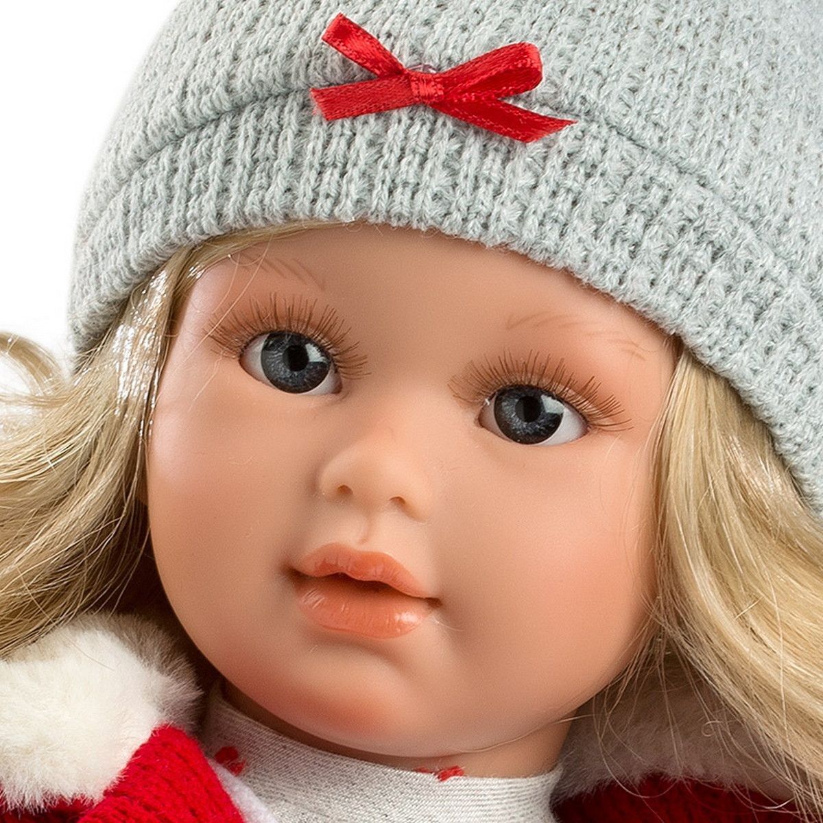 Laleczka Martina 54023 ma 40 cm i wykonana jest z delikatnego, przyjemnego w dotyku winylu. Jej miękki brzuszek wypełniony jest wyściółką. Lala ma niebieskie oczka z wklejonymi rzęsami oraz długie, falowane włosy w kolorze blond. Martina ubrana jest w śliczną, szarą sukienkę z czerwonymi kokardkami oraz w czerwony, dzianinowy bezrękawnik z kapturkiem z białym misiem.