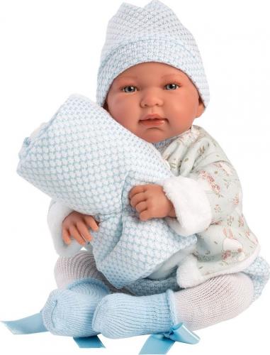 Lalka marki Llorens mierzy aż 44cm jest wyjątkową zabawką dla dzieci w każdym wieku. Tino jest ubrany niebieski, ażurowy rampers, białe rajstopki, niebieskie skarpetki z kokardkami, niebieską czapekę. Ponadto Tino ma na sobie cudowną kurtkę w króliczki z futerkową podszewką zawiązywaną na sznureczek z pomponami oraz bonetkę do kompletu. Do zestawu dołączono milutki kocyk z kokardą. Materiałowy brzuszek lalki wypełniono miękką wyściółką, po naciśnięciu go lalka zacznie płakać. Tę piękną, ciekawą buzię pokocha każde dziecko. Tino ma urocze niebieskie oczy, długie rzęsy i śliczny, mały nosek. Oczy są otwarte na stałe, nie zamykają się. Rączki i nóżki są ruchome, dzięki czemu w łatwy sposób możemy układać lalkę jak tylko chcemy. Lalka została zapakowana w ozdobny karton. Załączony smoczek pełni funkcję dekoracyjną. Kochamy hiszpańskie lalki Llorens!