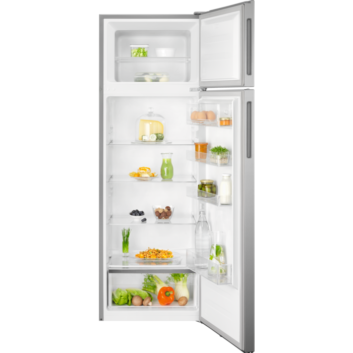 Chłodziarko-zamrażarka z górnym zamrażalnikiem z technologią LowFrost, wyświetlaczem LDC i oświetleniem LED, kolor srebrny.