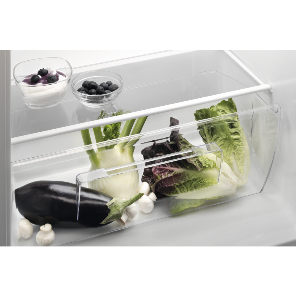 Przezroczysta szuflada na warzywa o pełnej szerokości pozwala z łatwością przechowywać większe i dłuższe produkty. Rób swobodnie zakupy, wiedząc, że w chłodziarko-zamrażarce masz wystarczająco dużo miejsca na większe produkty.
