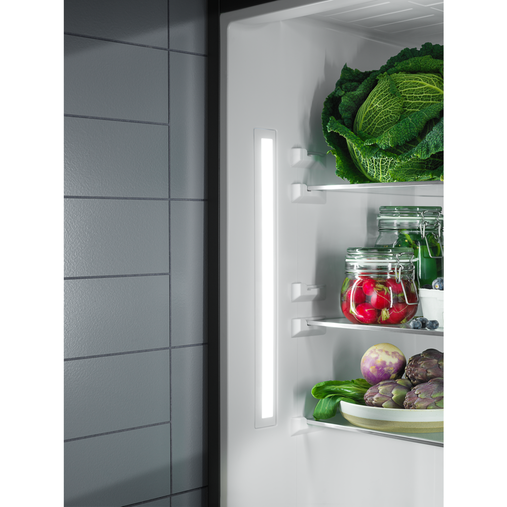Wbudowane oświetlenie LED zapewnia doskonałą widoczność w chłodziarce. Dyskretne, energooszczędne lampki oświetlają jasnym światłem całą przestrzeń. Zużywają przy tym dziesięciokrotnie mniej energii niż standardowe oświetlenie.