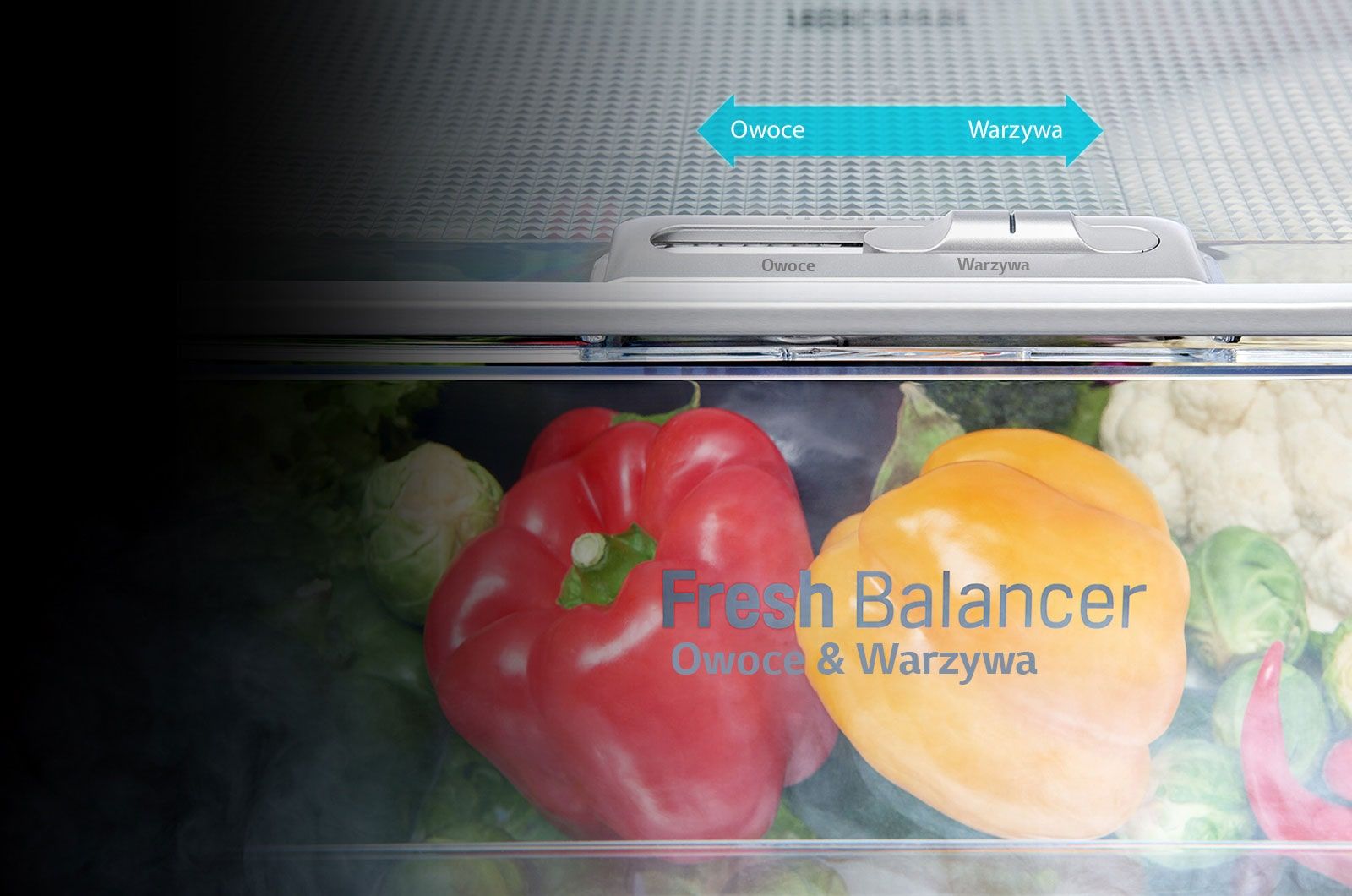 Wmontowany w drzwi lodówki smukły dyspenser lodu pozostawia więcej miejsca w jej wnętrzu. Wygodna półka na wino utrzyma do czterech butelek w idealnej temperaturze do spożycia. Wewnątrz znajdziesz podręczny pojemnik - przestrzeń do przechowywania mniejszych produktów, takich jak delikatesy czy ser, w optymalnej temperaturze. Za pomocą przełącznika w komorze FRESHBalancer™ ustawisz odpowiednią wilgotność dla owoców i warzyw, utrzymując ich świeżość na dłużej.