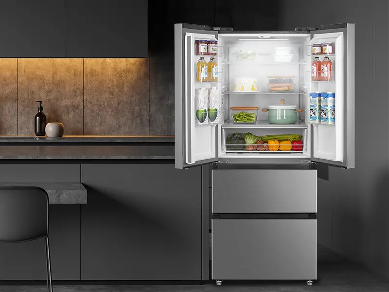 Lodówka Midea MERF402FIE02 typu side by side to stylowa i nowoczesna chłodziarko-zamrażarka w układzie french door. Stworzona z myślą o wygodzie codziennego użytkowania oraz wysokiej funkcjonalności, oferuje dużą pojemność 391 litrów, dobrze zaplanowane wnętrze i nowoczesne technologie, które wspierają dłuższe zachowanie świeżości żywności oraz pomagają ograniczyć jej marnowanie.