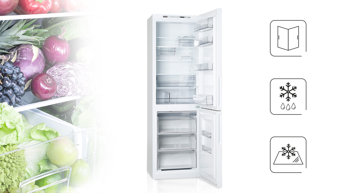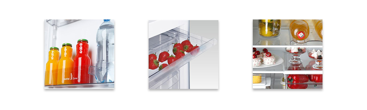 W części chłodzącej do dyspozycji są cztery szklane półki z możliwością regulacji ich położenia. Dodatkowo, dla najbardziej wymagających produktów takich jak wędlina, ser, owoce czy warzywa, w dolnej części znajdują się dwa pojemniki Super Fresh Box i Green Box. Uzupełnieniem przestrzeni jest wysuwany, podwieszany do półki Pull Box oraz leżak na dwie butelki.